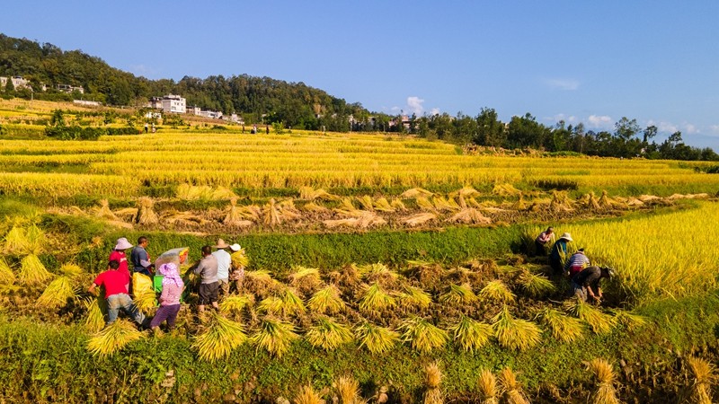 金秋時(shí)節(jié),瓜果飄香、田野金黃,農(nóng)民搶抓晴好天氣,收獲勞動(dòng)果實(shí)。9月18日,昭通市永善縣溪洛渡街道新拉村村民在收割水稻。